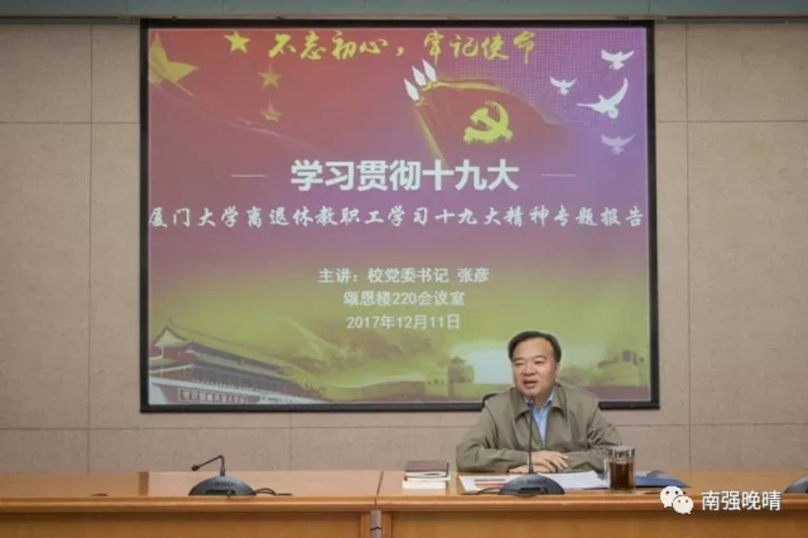 张彦指出,习近平新时代中国特色社会主义思想的提出并写入党章确立为我们党必须长期坚持的指导思想,是党的十九大最大的亮点。学习宣传贯彻大会精神,组织党员、干部和师生员工认真学习习近平新时代中国特色社会主义思想并用以武装头脑、指导和推动学校“双一流”建设是厦门大学当前和今后一个时期的首要政治任务。他肯定离退休老同志是学校建设的亲历者,为厦大事业发展做出了重要贡献,他们革命和建设的经历是一笔宝贵的财富,拥有独特的影响力、号召力和凝聚力。希望老同志们能够充分发挥政治优势、经验优势和宣传动员能力,积极带动教职工、青年学生和家庭成员共同学习贯彻党的十九大精神。